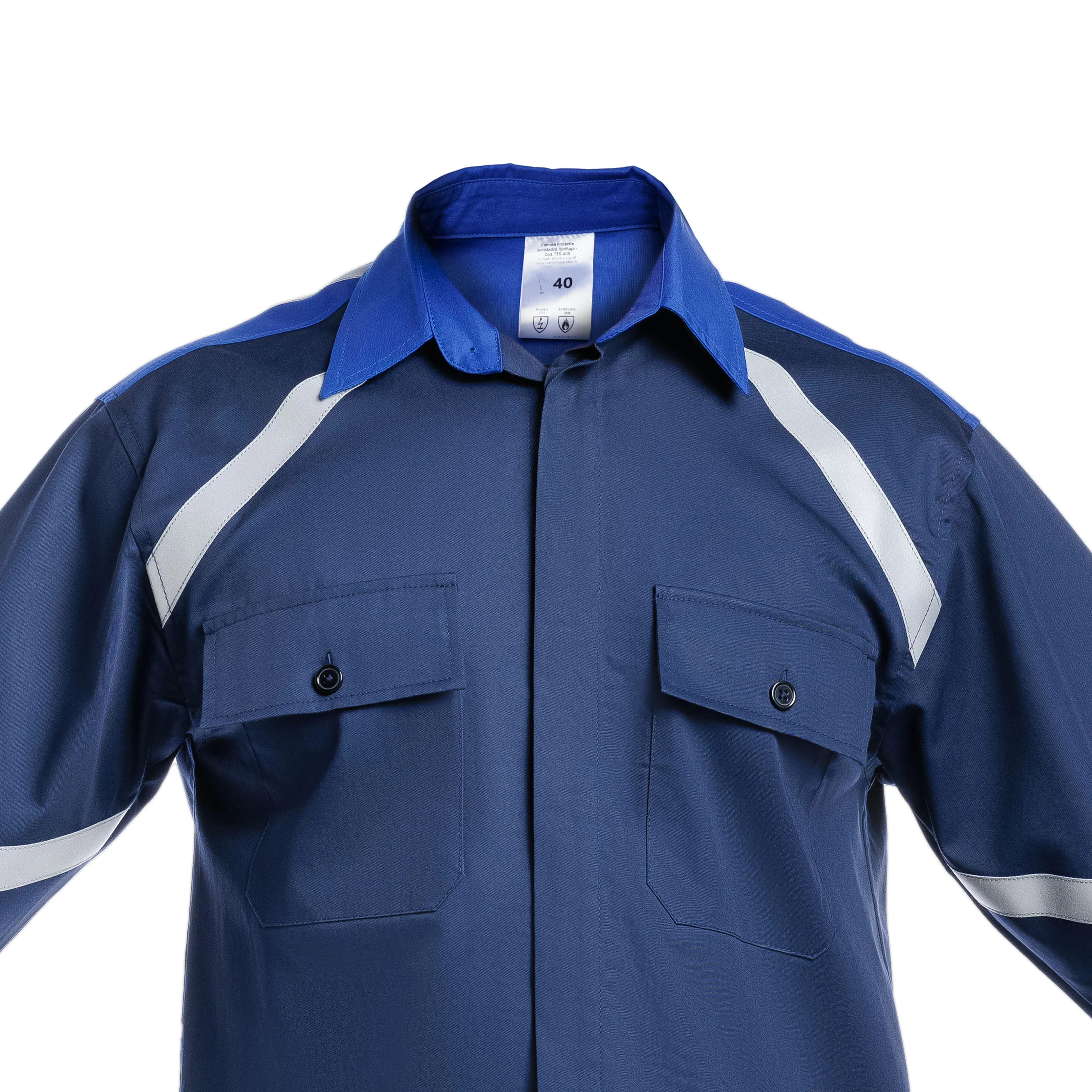 Cămașa de protecție iTEX Design (TEX-ALLS, design bicolor modern cu baza bleumarin și contraste albastre) reprezintă o soluție excelentă pentru angajații din diferite industrii care au nevoie de protecție eficientă și confort în timpul activităților lor zilnice. Fabricată în România din țesături ignifuge, antistatice și antichimice având un gramaj aproximativ 200-220 gr/mp2, cămașa noastră de protecție oferă un nivel optim de siguranță și performanță. Aceasta este proiectată pentru a rezista la riscurile specifice ale mediului de lucru și oferă o barieră eficientă împotriva focului, scânteilor, substanțelor petroliere și altor pericole.