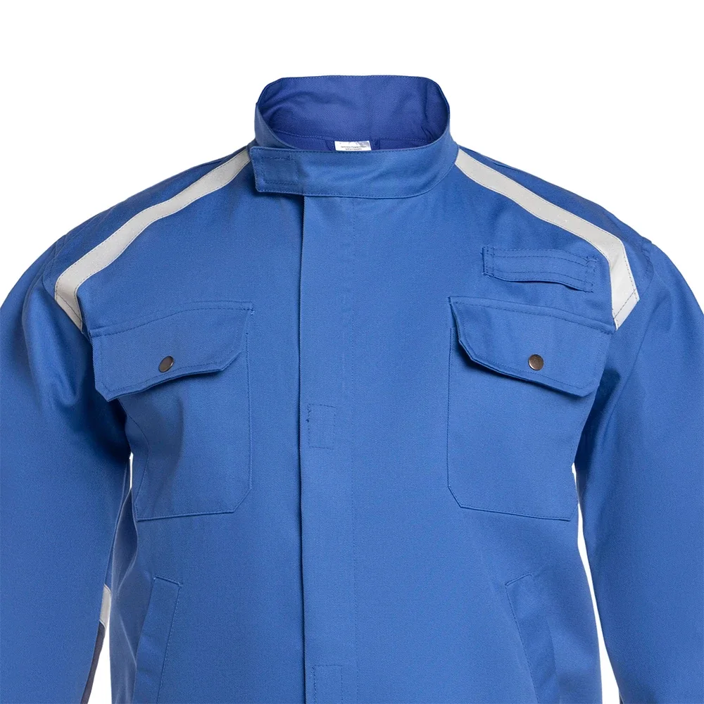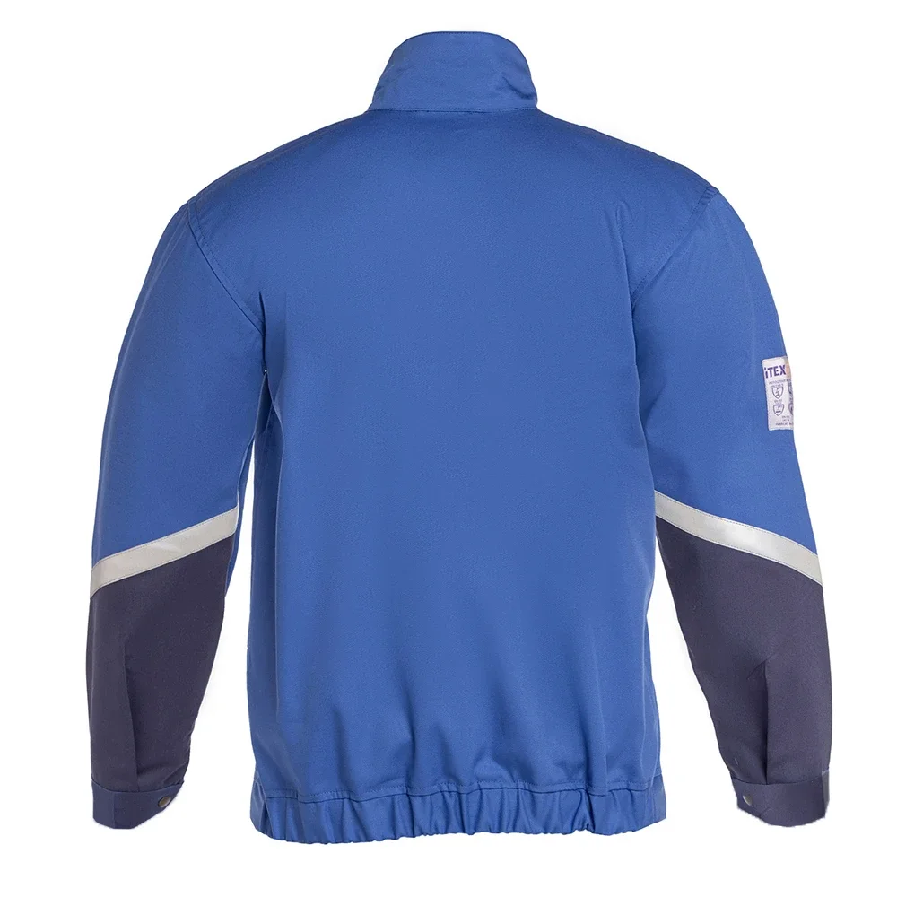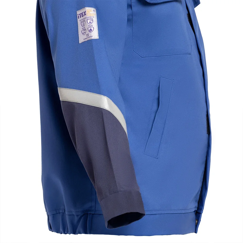 Jacheta de protecție iTEX Design realizată în România din țesături ignifuge, antistatice și antichimice și certificata CE. Designul modern bicolor si asimetric, combinație albastru royal cu bleumarin transforma paradigma echipamentelor de lucru clasice. Proiectată pentru a asigura siguranță și confort în medii de lucru solicitante, jacheta TEXFB11 este fabricată cu cele mai avansate materiale de protecție. Fie că lucrezi în industria construcțiilor, în domeniul energetic sau în orice altă industrie expusă riscurilor, jachetele noastre îți oferă protecție optimă și funcționalitate superioară. Fiind certificate CE, ele îndeplinesc standardele europene de siguranță și calitate, asigurându-ți că echipamentul tău de protecție este conform cu normele în vigoare.