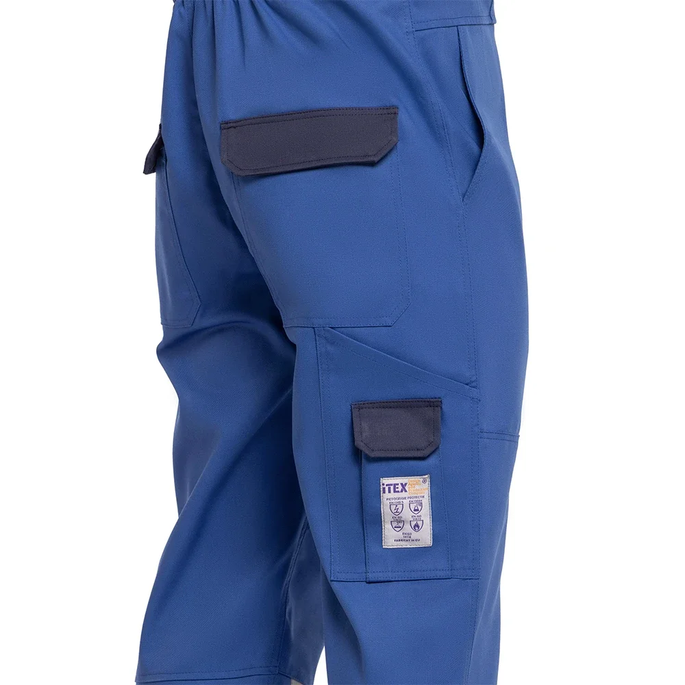 Pantalonii de protecție cu pieptar iTEX Design model TEXFB11 sunt realizați în România din țesături ignifuge, antistatice și antichimice având un gramaj aproximativ 240-260 gr/mp2 potrivit pentru utilizarea All-Seasons și sunt certificați CE. Designul modern bicolor, combinație albastru cu bleumarin transforma paradigma echipamentelor de lucru clasice. Pantalonii TEXFB11 au fost proiectați pentru a asigura siguranță și confort în medii de lucru solicitante și periculoase și sunt fabricati din cele mai avansate materiale de protecție. Fie că lucrezi în industria construcțiilor, în domeniul energetic sau în orice altă industrie expusă riscurilor, jachetele noastre îți oferă protecție optimă și funcționalitate superioară. Fiind certificate CE, ele îndeplinesc standardele europene de siguranță și calitate, asigurându-ți că echipamentul tău de protecție este conform cu normele în vigoare.